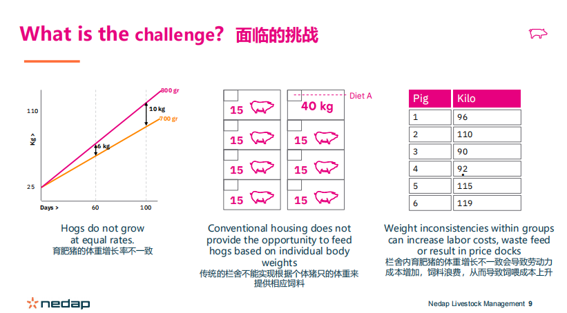 张列认为,目前中国育肥猪面临的多重挑战。首先,育肥猪的体重增长率不一致;第二,传统栏舍不能实现根据个体猪只发体重来提供相应饲料;第三,栏舍内育肥猪体重增长不一致会导致劳动力成本增加、饲料浪费、思维成本增加。