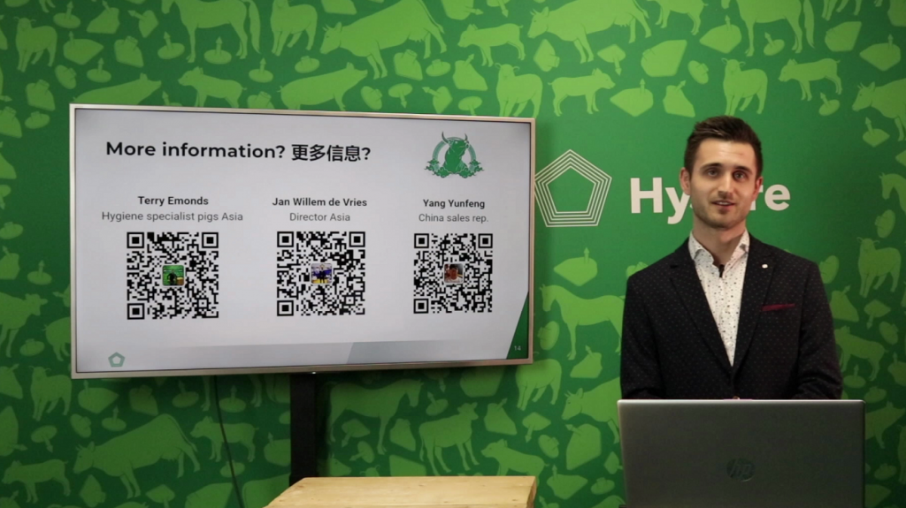 Terry Emonds先生在视频演讲中为我们介绍了施海普集团的三个代表产品之一——HyCare,即为每一位专业畜牧养殖者提供最好的卫生方案。HyCare是一种注重畜禽养殖卫生的综合管理方法,重点关注无菌的生活环境、无孔的表面、无虫害的猪舍、最佳关爱、清洁的饮用水等五个方面。每个方面都有专业的卫生程序。HyCare也针对不同的畜种开发了专门的程序。