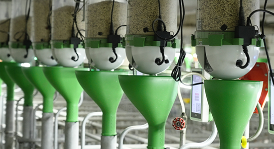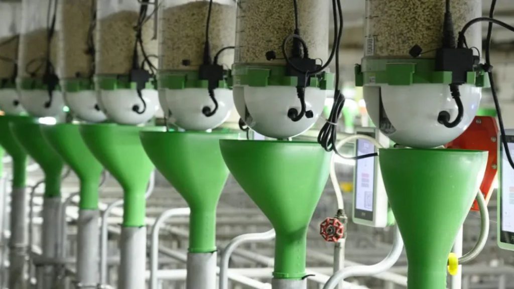 在营养结构上,扬翔智能设施楼房猪场配套了饲料厂,养殖端的智能设备实时采集猪只个体数据,通过算法分析出猪只个体营养需要并传输到饲料厂,饲料厂再通过精准配方进行精准生产,最后利用精喂仪精准饲喂,充分满足营养需要并且避免了饲料浪费,真正做到随需随配、随配随产