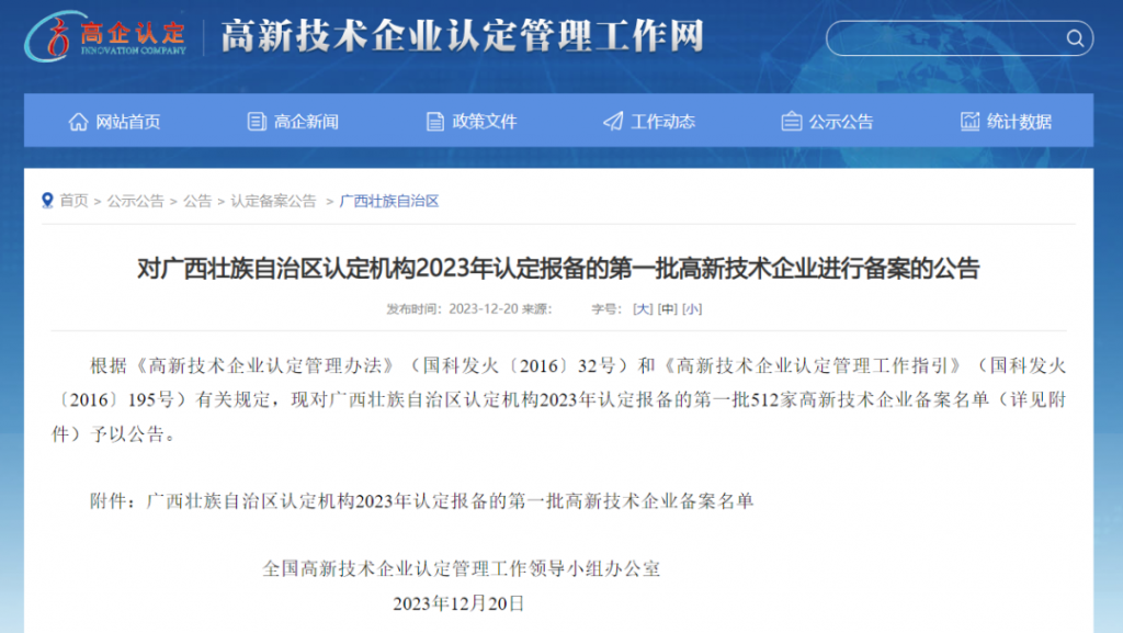 12月20日,全国高新技术企业认定管理工作领导小组办公室正式公布《广西壮族自治区认定机构2023年认定报备的第一批高新技术企业备案名单》,秀博基因名列其中顺利通过国家高新技术企业认定,这标志着公司的科技创新能力获得权威认可。