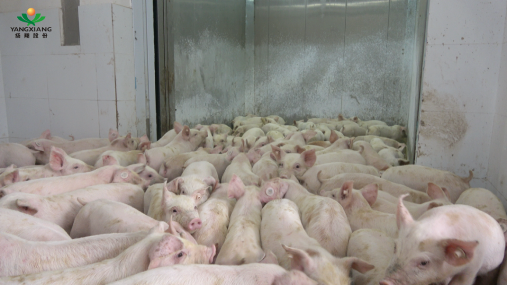 常规的屠宰方式是生猪出栏后,经长途跋涉运输到屠宰场进行屠宰,猪会产生应激反应,一是累,肌肉里面的乳酸就出来了,二是恐惧,肾上腺素就出来了,全部在内脏里。虽然猪运输到屠宰场还需静养12个小时,但是12个小时并不能解决这些问题。而在扬翔智能设施楼房猪场,生猪到出栏时间,直接坐电梯下楼,听着音乐送上传送带,利用二氧化碳窒息法致晕,就地屠宰,充分保障了肉质的优良。