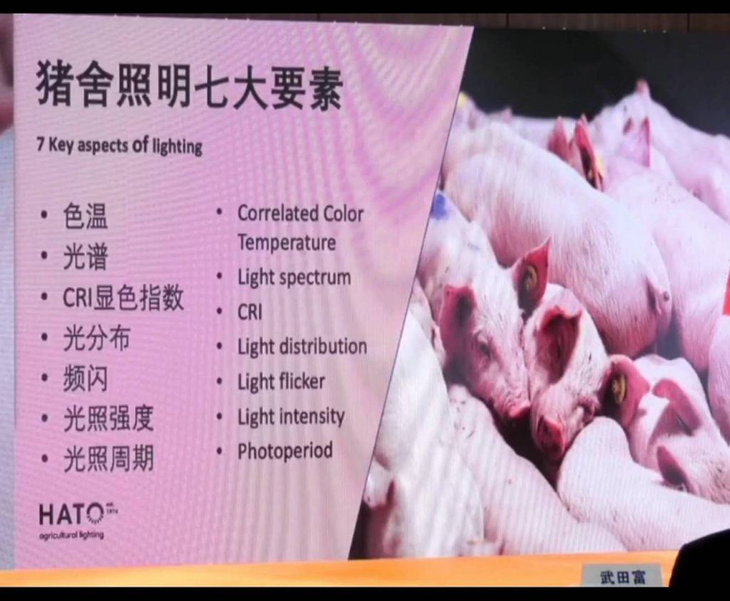 研讨会上,荷德照明(HATO)资深光照设计师单天超先生向大家分享了题为《照明对猪的福利和生产的影响》报告,从专业的角度分析了猪对光线的感知、对颜色的分辨以及频闪对猪的影响。让大家了解到了通过合适的光照可以区分猪的舒适区、排泄区和休息区,让猪活得更加的体面。