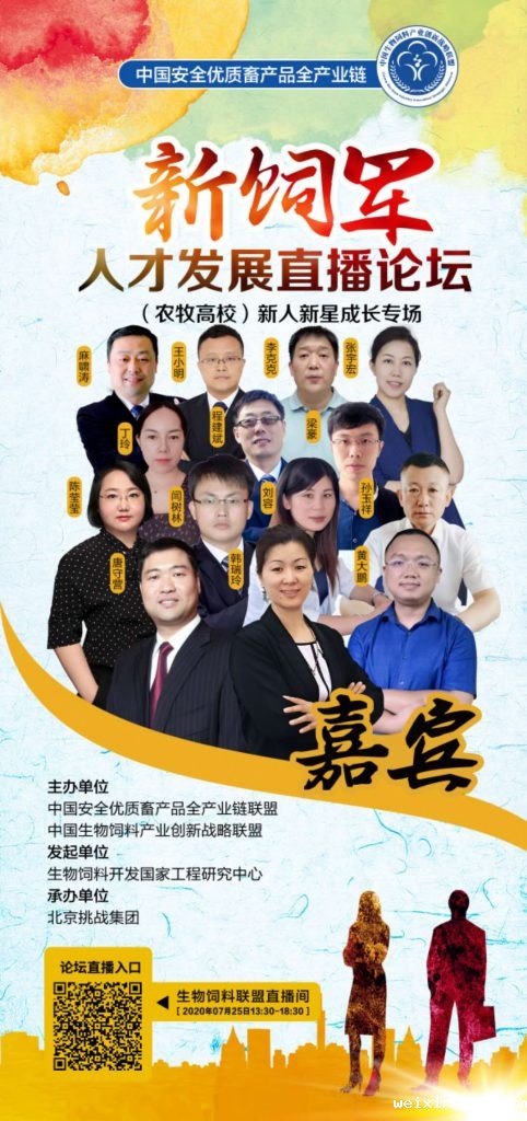 7月25日,中国安全优质畜产品全产业链“新饲军”人才发展论坛盛大开幕,论坛由中国安全优质畜产品全产业链联盟、中国生物饲料产业创新战略联盟主办,生物饲料开发国家工程研究中心发起,挑战集团承办,集合国内100余所知名涉农院校和畜产品全产业链300余家著名企业,为安全优质畜产品全产业链企业和高校搭建起云端人才交流、就业、培养平台,为农牧领域的企业和人才插上“生物饲料科技芯片”的翅膀。论坛中主持人与九位行业专家针对“毕业生的人生选择”展开互动讨论。